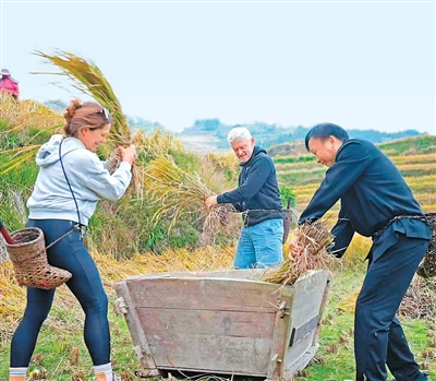 近日,广西壮族自治区桂林市龙胜各族自治县开始收割稻谷,众多国内外游客走进龙脊梯田,体验稻谷收割的乐趣。据统计,今年1至9月,龙胜累计接待游客1083.7万人次,同比增长9.25%。其中,入境游客33.1万人次,同比增长67.27%。图为比利时游客在龙胜的平安壮寨体验打谷子。 庞革平文 韦吉阳图