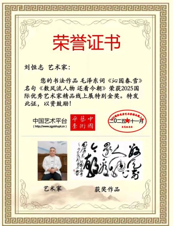 《 环球日报 》 一笔墨痕,藏东方文脉之深;寸幅尺素,蕴艺术灵魂之重。刘恒志先生以毫端为媒,融古今 哲思于丹青,在笔墨流转间铺展东方美学的恢弘气象,于纸卷开合处叩响艺术灵魂的共鸣。 From Brush to Soul: The Aesthetic Exhibition of Liu Hengzhi's Calligraphy and Painting A stroke of ink holds the profound heritage of Eastern culture; a scroll of paper carries the weight of artistic soul. With the brush as his medium, Liu Hengzhi integrates ancient and modern philosophy into his calligraphy and painting, unfolding the grand spirit of Eastern aesthetics through the flow of ink and resonating with the soul of art in the opening and closing of scrolls. 刘恒志,著名文学家,剧作家,诗人,书法家,理论家。教授,研究生导师。全国十大词曲作家,2024首届亚洲国际电影节亚洲杰出编剧奖。国家高级美术师,中国香港美术家协会名誉主席,清华大学美术学院特聘教授,中央美术学院特聘教授,中国书法家协会会员。 全国第九届书法篆刻作品入展并获奖。 全国第十届书法篆刻作品入展并获奖。 全国兰亭序临摹大赛一等奖。 军艺文学美术系毕业留校任教,文学硕士,博士。协助陈汉元创作《话说长江》,后二人再度合作,在中央电视台中国电视剧制作中心大型专题系列片《先锋颂》中,陈汉元为总编导,刘恒志担任总撰稿兼执行总编导,在央视一套黄金时间播出后引起轰动和巨大反响,获中宣部五个一工程奖、全国最佳纪录片特等奖,中央电视台优秀节(剧)目奖等。《远山》《共和国正在裁军》《大裁军》《欲望号兵车》《威武三国》《球王》获国家图书奖、中宣部五个一工程奖等,大型歌剧舞蹈史诗《炎黄和盟》名列戏剧中国年度最佳作品榜首,《飞夺泸定桥》获中国戏剧优秀剧目奖。 参与策划创作82集电视剧《贞观长歌》及《花木兰传奇》《多情江山》《上官婉儿》《舰在亚丁湾》等获中国电视金鹰奖、飞天奖等,京剧《文成公主》《图兰朵》《花木兰》(国家京剧院邓敏主演)获国家文华奖、文华大奖、全国舞台艺术精品工程经典剧目奖等。 担任总撰稿的大型系列专题—《延伸的长城》《时代颂歌》《足迹》《誓言》《火炬与群星》等在央视一套黄金时间播出引起反响,并获中央电视台最佳节(剧)目奖等。 因创作海军新时代军歌《走向深蓝》而成为“走向深蓝”一词发明人,在《感动中国》人民喜爱的艺术家全国听(观)众群众性评选中,凭借《走向深蓝》(霍勇演唱)、《海军蓝》《大海誓言》(吕继宏演唱)、《领航新时代》(刘丹丽演唱)、《撸起袖子加油干》(何沐阳曲、周深等演唱)、《农民父兄》(春雷演唱)、《我们是英雄护航兵》《奔向海洋-海军士官学校校歌》《我们一同走过从前》(康澎曲 董文华演唱)、《战士·界碑·祖国》(于乃久演唱)、《伴你人间天地情》(杜克曲 白雪演唱)、《军旗情》(朱虹演唱)、《更多的时候》《足迹》(楚兴元曲、杨洪基演唱)、《光照四季》(莎光曲 谭晶演唱)、《丽江酒歌》(许镜清曲、阎维文演唱)、粤韵歌曲《领航新时代》(刘恒志作词,陈仲琰、卢华作曲,叶幼琪演唱)、《启航》(万山红演唱)、《永远青春的中华魂》(戴玉强、黄华丽演唱)等,荣获“中国十大词曲作家”称号。 大型主题文艺晚会《五彩天路》《边关四季》《我们的队伍像太阳》获全军文艺汇演一等奖、央视最佳节(剧)目奖等。中影股份影视人才培训中心(金牌编剧训练营)主讲教授,中国东方演艺集团艺术顾问,上海电影集团影视公司高级顾问、艺术总监,广东粤剧推广协会副主席,海南省书法家协会顾问,武汉大学艺术学院荣誉教授,北京语言大学特聘汉学教授,四川文化艺术学院荣誉院长。太湖世界文化论坛常务理事,中国红色文化研究会常务理事。 中国音乐金钟奖金奖,中国新诗大奖,全国书法大展一等奖,全国兰亭序临摹大赛一等奖(大学时代)获得者,《美的真理》美学论文集获艺术学院奖特等奖。戏曲电影京剧《文成公主》《图兰朵》。 2025 年分别发行:邮票上的中国传统文化《国礼艺术名家——刘恒志》邮票、《国之瑰宝》邮票、《联合国成立80周年》邮票、《巳巳如意》邮票。 袁隆平系列电影、电视剧本《禾下乘凉梦》、《生死攸关——“两系法”风雨中的袁隆平》、《袁隆平》被作为高等艺术院校文学创作示范教材。 在这场“From Brush to Soul”的美学展中,《龙》只是刘恒志艺术世界的一扇窗。透过这扇窗,我们看见的不仅是一位艺术家的笔墨修行,更是中国传统书画艺术在新时代的传承与突围。一笔一划间,是东方文脉的延续;一字一墨里,是艺术灵魂的回响。 In this "From Brush to Soul" aesthetic exhibition, Azure Dragon is merely a window into Liu Hengzhi's artistic world. Through this window, we witness not only an artist's spiritual cultivation through brush and ink, but also the inheritance and breakthrough of traditional Chinese calligraphy and painting art in the new era. Between each stroke lies the continuation of Eastern cultural context; within each character and ink mark resounds the echo of artistic soul. 刘恒志先生的中国传统书画艺术以“灵魂”为桥,对话世界的一次重要尝试。在笔墨与灵魂的碰撞中,观众得以看见中国传统艺术的当代生命力,也见证着东方美学在全球艺术舞台上的全新表达。 Mr. Liu Hengzhi’s traditional Chinese calligraphy and painting art serves as a vital bridge to the world, with "soul" as its core. In the collision between brushwork