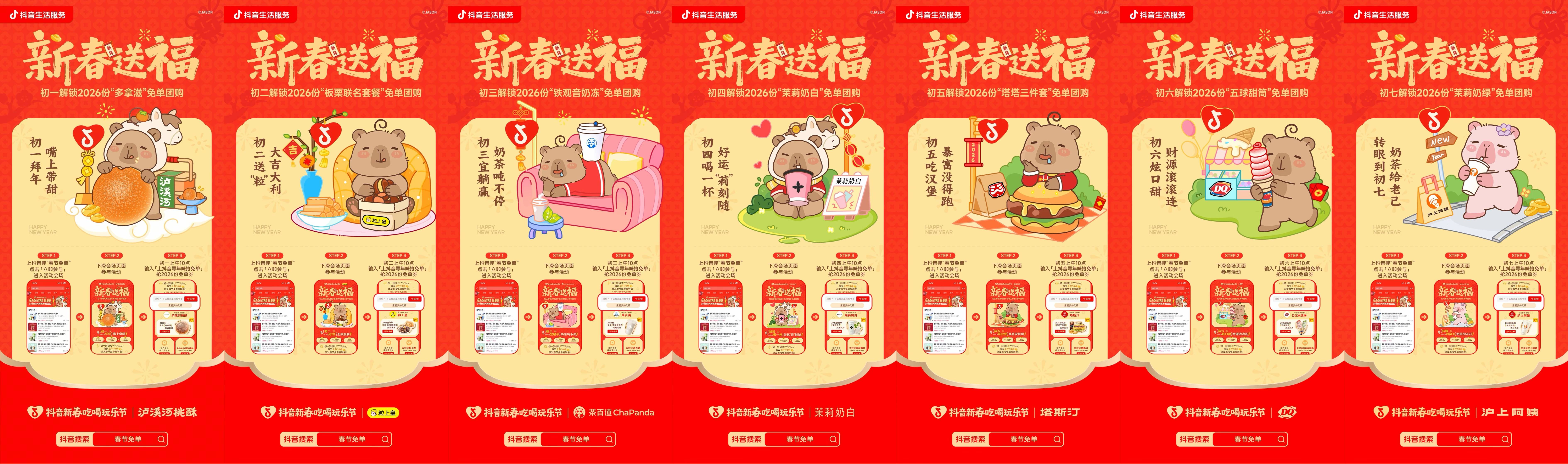 《 环球日报 》 腊月年味浓,囤货正当时!随着春节的临近,年味也从囤好的年货、买好的新衣、刚换的美甲里悄然溢出。距离 2026 年春节已进入倒计时,越来越多人踏上归乡旅途,00 后也逐渐成为年货筹备主力,以年轻视角重新定义新年,用新潮和心意相结合,打造属于新一代的备年新体验。 在此背景下,抖音生活服务重磅开启「超惠逛年货节」,与大家一同“抖音团购「新」年货,一起囤个团圆年”。在为期24天的活动中,平台围绕“好好逛”“好好吃” “好好看”等核心场景,打造年货必囤活动,邀请大家跟着“卡皮巴拉”一起“豚”年货,拿捏各式各样的新年准备,用最好的状态迎接新年福气到来! 跟着卡皮巴拉囤年货,马年新潮年味轻松拿捏 本次年货节精准洞察当代年轻人备年心态,以全民级治愈 IP “卡皮巴拉” 为情感切口,将软萌松弛的形象与春节氛围完美融合,同步上线联名红包、专属表情包等趣味内容,让萌趣感贯穿新年全场景。活动还特别上线卡皮巴拉马年限定套餐,购买即可领取限定周边,实现“线上种草、线下进店领赠品”的心动体验闭环,让大家在抖音 “团购备年” 不仅体验到十足年味,更感受到梦幻联动背后的满满 “新” 意。 全国各大商圈、商家门店也设立马年主题装饰搭配卡皮巴拉萌趣形象,化身年货节专属打卡点,持续点燃线下消费氛围。线上线下联动呼应,让大家无论是参与抖音团购,还是到店沉浸式打卡,都能沉浸式感受到年味与潮流的完美融合。 过年期间,抖音新春吃喝玩乐节联动卡皮巴拉带来重磅惊喜,大年初一至初七,抖音生活服务携手泸溪河、粒上皇、茶百道、茉莉奶白、塔斯汀、DQ 冰淇淋、沪上阿姨、七大品牌,每天上线2026份免单,从甜品饮品到零食和特色美食,陪大家新年七天乐享年味。上抖音搜“春节免单”进入活动会场,初一到初七每天上午10点输入口令「上抖音寻年味抢免单」即可参与抢2026份免单。 全品类年货花式种草,引领新春消费新趋势 本次活动从传统年货到新潮好物全覆盖,打造一代人有一代人的年货清单。除经典年货三件套外,更上线符合年轻人偏好的新衣、美妆、家居、餐饮、清洁等全品类 “新” 年货,一站式满足囤券备礼、焕新穿搭、家庭大扫除、预订团圆饭等多元需求,掀起全民新潮囤货热潮。 线上相关热点话题强势破圈,撬动海量商家与达人共创内容:#当代网友在置办一种很新的年货 话题精准捕捉年轻一代主导备年的趣味转变,达人创意内容引爆全网共鸣,全网曝光量破千万;#大馋丫头的马年具象化了 聚焦春节解馋场景,激发全民分享欲,话题热度居高不下;#这口家乡味等我一年了 深耕年味与思乡情感,让家乡味相关套餐成为备年热门选择;#我的新年质感穿搭已就位 登总榜TOP2、种草榜TOP1,峰值热度1194.1w,精准击中新年焕新穿搭需求,带动服饰品类热度飙升;#跟着抖音颜值天团新年美出圈 登抖音热榜18名、种草榜第1名,总曝光280.3w,总互动17.66w,聚焦中式养元、美发护发、护肤管理、美甲美睫等新年变美趋势,达人共创内容引爆变美热潮,引领新年颜值焕新新风向。 从“新潮备年”到“解馋清单”,从“家乡团圆味”到“新年质感穿搭”,再到“颜值天团美出圈”,抖音生活服务深度切入年轻人过年期间的不同情感节点与真实需求,覆盖餐饮、零售、综合服务及丽人等多元赛道,以话题热点深耕场景,用内容势能引领消费新趋势,不断强化“春节上抖音团购,吃喝玩乐囤新年货”的用户心智。 马年年货爆品清单人传人,超值口令红包攻略全网扩散 活动期间,一份超全的抖音马年爆品清单被大家争相转发,清单里不仅精选了零食生鲜、餐饮美食、服饰珠宝、商超好物等各类爆品,还有超级实惠的价格和红包福利。凭借超高实用性与实在性价比,爆品清单在微信社群、抖音、小红书等平台持续刷屏传播,成为大家备年货的热门参考指南,累计浏览量超 2 万,高峰时段在线使用人数超 2000 人, 以“人传人” 式口碑传播实现大范围曝光,让更多人轻松发现好货、接住真实惠。 除了爆品清单福利,口令红包玩法也凭借浓浓年味与惊喜感,吸引用户踊跃参与。用户仅需在抖音中搜索指定口令红包关键词,即可一键解锁零食、团圆饭、服饰、珠宝、便利生活、变美等多品类专享红包,让每一次囤货都更划算。 在春节这个充满仪式感的节点,口令红包早已不只是一张优惠券,更成为传递祝福、共享年味的情感纽带。充满年味的互动形式与实在福利,进一步激发了用户自发分享的热情,不少 KOC 与普通用户主动在社群、小红书、抖音等平台扩散口令,形成高效自传播效应,带动更多人主动搜索参与,让囤年货也变成一件有温度、有惊喜的节日体验。 年货小春晚,名嘴连麦解锁年味新玩法 本次年货节创新打造「囤」货发布会,以“年货小春晚”为内容主线,通过频道联播首秀 × 品类串台互动 × 电子卡皮巴拉趣味联动,携手知名主持人耿晨晨、阿喆、刘仪伟、马可,带来一场年味十足、氛围轻松的沉浸式备年盛宴。 活动围绕「囤个团圆年」、「囤个金运年」、「囤个美味年」、「囤个漂亮年」四个新春场景展开,四位名嘴现身"马上'囤'货发布会",耿晨晨在发布会上教大家如何轻松搞定一桌被夸一整天的团圆家宴;阿喆围绕新年开运需求,带大家解锁了用年终奖置办黄金好物的讨彩思路;刘仪伟则分享了能让七大姑都赞不
