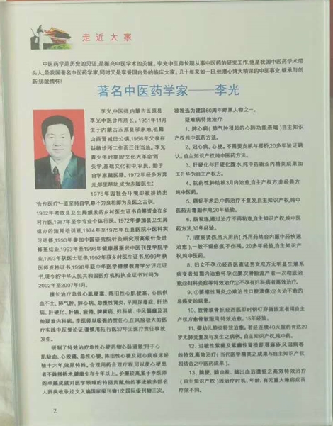 《 环球日报 》 李光医师是基层中医的一面旗帜,他以“精”“诚”引领自己的医学道路,执着追求,秉承“仁术慈心,修身济众”的信念守护人民健康。是基层群众的健康“守门人”,健康中国路上的筑梦者。 伟大出自平凡,平凡造就伟大。只要有坚定的理想信念、不懈的奋斗精神,脚踏实地把每件平凡的事做好,一切平凡的人都可以获得不平凡的人生,一切平凡的工作都可以创造不平凡的成就。 李光 男,中医师,1951年11月出生于内蒙古五原县邬家地,祖籍山西晋城巴公镇,1956年因父亲在益敏诊所工作而迁往当地。现任内蒙古五原县李光中医诊所所长,兼任中国科技创新发展促进会传统医学分会内蒙古五原县工作站负责人,燕京函授医学客座教授、《中国医者先锋大典》编委会编委、《中国中医药名医绝技秘方藏典》编委会学术顾问、中国医疗保健国际交流促进会中老年保健专业委员会理事等职。 自幼勤于自学家藏医籍,1972年成为“赤脚医生”并参加县卫生局主办的短期培训班,1974年至1975年在县医院中医科实习进修,1982年考取县卫生局颁发的乡村医生证书并自筹资金在乡村行医,1987年至今专业个体行医,1993年获医士证书,1993年参加中国研究院针灸研究所高级针灸进修班结业,1993年至1996年健康报振兴中医刊授学院毕业,1998年获中华医学会继续教育学分评定证书,1999年获医师资格证书,2002年获得中华人民共和国医疗机构执业证书。 临床经验十六年,行医47年无医疗责任事故发生,研制出了“心脉通散”。擅长治疗急性心肌梗塞,陈旧性心肌梗塞,心肌供血不全,肺气肿,肺心病,冠心病,急慢性肾炎,早期尿毒症,肝热病,肝硬化,肝硬化腹水,肝癌,肠粘连,Ⅱ度烧烫伤,疲倦,抗药性肺结核,癌症手术后,萎缩性胃炎,难治性口腔溃疡,股骨颈骨折,婴幼儿肺炎,过敏性紫癜及紫癜性肾损害,荨麻疹,风湿病,脾胃病,妇女不孕,妇科病,中风偏瘫及其他众多疑难内科病。对用中药治疗心梗、脑梗深有研究。对高血压、高血脂、糖尿病并发症的防治有一定经验。 鉴于其卓越成就,以及对医学领域的特别贡献,被授予“共和国英模人物”“国医传承楷模”“中国民间中医药特技人才”“中医疑难专家”等荣誉称号,并入选共和国建设者专题邮票。事迹已载入《中国医者先锋大典》《中国医学临床研究》《中国优秀医务工作者文集•杏林英才大典》《亚洲医药》《世界名医成果研究》《世界名医论坛》《世界传统医药新进展》《中国中医药名医绝技秘方藏典》《世界优秀医学专家人才名典》《中国中医名医名科名院品牌博览》《华夏人物传记》《光彩人生回眸•红色档案》《当代影响力人物经典》《走进大家》《中国传统医学专家健康论》《劳动者之歌》《当代中国英模人物风采录》《中国领导干部科学发展的理论与实践》《中医药特色大典》《国医名师经验录•华夏瑰宝》《建国六十周年人物成就大典》《中国世纪专家传略》《中华名医风采》《国际互联网全球寻医问药医学专家人才传略》中国卷第一部、《中国专家大辞典》第十三卷等大型辞书中。其发表的论文入编国家级刊物1次,国际级刊物3次。 治疗常见病: 1、各型感冒,包括风寒感冒,风热感冒,流感,自拟成方,一方多用,老,幼兼可用之以量不用,有中老年病可用,因对其对兼病无害而安全。 2、阑尾炎,特效治疗(自主知识产权),凡未穿孔者即时用药即可控制,连续服药7-15剂(天),可多年不复发。治愈率95℅。急性慢性兼宜无手术条件或不愿手术者,或经济状态欠佳者实为良方妙法!有手术后多年,发生包块者,有未手术包块者兼于7天内包志消失!此优于手术之法! 3、慢性气管炎、胃炎、预防感冒,治疗面神经麻痹等。用羊肠衣线埋于相应穴位(长效针法)以经络学说经络所过主治所及之理指导取穴,以针灸理论指导取穴,以现代免疫学说羊肠衣线属异体蛋白有激发促进抗体之产生而有针灸兼药物之作用所更具优势,是一次埋线相当于20-30天之连续针刺。此非自主产权进修学来的。 4、治疗湿热诸邪引起的多种病症。以脉症或望诊之色,之舌苔确认。 5、以色脉辨知五脏病症(四诊合参) 6、能以四诊合参与现代病理药理学确认疾病,确立治则,指导拟方遣药,能知潜病与未病,治疗患者主诉之病时兼顾潜病与未病,拟方遣药主、未病及整体状态兼顾之力求,有益无损,力求方药君臣佐使合理,因此一直保持了医患和谐,医疗责任事故鲜有。通晓脉动诊,眼诊,舌诊,耳诊穴位反应点诊法用督脉与膀胱经在诊病与治疗中应用。善用内经语录确立治则。 地址:内蒙古自治区临河区幸福里小区商业街李光中医药诊所 |