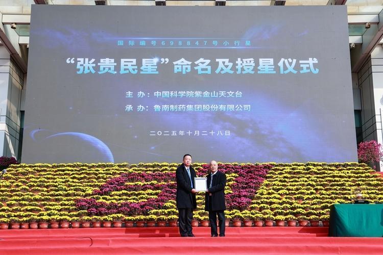 《 环球日报 》 科技日报记者 王延斌 10月28日,“张贵民星”命名及授星仪式在山东省临沂市鲁南制药集团隆重举行。国际天文学联合会小天体命名委员会正式批准,将编号为698847的小行星永久命名为“张贵民星”。从此,浩瀚星河中又多了一颗以中国人名字命名的星辰。 这颗小行星是经由中国科学院紫金山天文台2009年10月14日发现,并经过多次精密轨道测定和国际认证程序后,最终获准命名。小行星命名是国际公认的崇高荣誉,通常授予在科学、文化、社会等领域作出卓越贡献的杰出人物。以科学家之名命名小行星,不仅是对其个人成就的肯定,更是对科学精神的礼赞与传承。 张贵民是我国著名药学专家,中国手性制药工程的领军人物,在中药经方传承发掘与现代中药制药融合创新方面作出了杰出贡献,带领鲁南制药集团在制药科技领域攻坚克难、创新争先,通过技术创新驱动医药产业升级,形成了从基础研究到产业化应用的完整链条,为中国制药行业的自主创新和高质量发展作出了重要贡献。 在命名仪式上,中国科学院紫金山天文台党委委员赵海斌表示,以一颗小行星为张贵民誉名,体现了国际社会对张贵民研究员科技成就的褒扬。这不仅是张贵民研究员的光荣,也是鲁南制药集团的光荣,更能弘扬和传承科学家精神,激励科技工作者不懈奋斗、勇攀高峰。 中国科技发展基金会理事长宋军指出,这颗以张贵民名字命名的小行星,巧妙地融合了张贵民的人生轨迹、企业成就与科学使命,成为人类探索未知、追求卓越精神的永恒见证。这一荣誉,不仅是对张贵民个人价值的星际认证,更是对所有为科技进步和社会发展默默奉献者的最高赞誉。 “这份荣誉不仅属于我个人,更属于所有并肩奋斗的鲁南制药科研同仁,属于我们伟大的祖国。”张贵民表示,科学探索之路漫长而孤独,但只要心中有光,便不惧黑暗。他愿做一颗铺路石,为后来者照亮前行的路。“这颗‘张贵民星’,将是我一生科研旅程中最璀璨的注脚,也将激励我继续在科学的星海中不断求索。”他表示。 在仪式现场,大屏幕上播放了“张贵民星”的轨道模拟动画——它静静地运行在火星与木星之间的小行星带中,周期性地绕日旋转,仿佛一位沉默的守望者,见证着人类文明对宇宙的不懈追寻。 (受访者供图) |