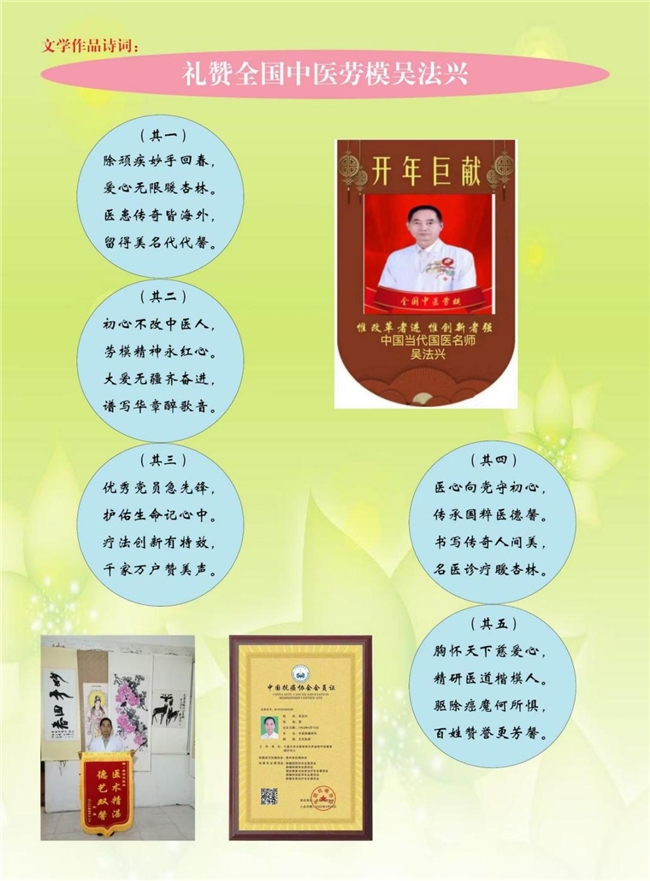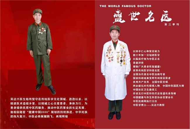 《 环球日报 》 中医文化是中华民族的瑰宝,也是世界人民的财富。中医药事业能够世代传承、经久不息,靠的是一代一代中医人的传承及坚守才能薪火相传生生不息。 他的影响力不仅仅体现在医学上,更在于他对中国传统医学文化推动,作为全球知名的医学专家,他的一举一动都备受关注,他的医学精神和不懈的努力,也成为无数年轻医学家的榜样,他不仅仅是一位优秀的医学大师,更是一位具有巨大影响力的医学偶像。他的成功,离不开他对医学的热爱和对医学研究的执着追求。他就是非凡成就杰出医学家——吴法兴医生。 从医多年,吴法兴医生始终将医德牢记于心,心系百姓。在几十多年的行医生涯中,他用精湛的医术和爱心,拯救着一个个鲜活的生命,重塑着无数患者的信心,使他们重获健康和幸福! 吴法兴,男,1953 年 04 月生,贵州人,中共党员,全国生产能手、全国劳动模范奖章获得者。现任贵州省水城县双水民间中医康复中心负责人,中国管理科学研究院华夏传统文化发展研究中心和全民养生促进工程组织工作委员会中医讲师、中医特色专家。1972 年 12 月 8 日参加中国人民解放军,陕西 0029 部队基建工程兵;1973 年参加共青团,同年加入共产党。1974 年荣获三等功一次;1975 年荣获三等功一次;1976 年又荣获二等功一次。同年被评为建设辽化先进标兵,在部队 12 年后转业胜利油田中建八局基建安装公司。1985 年招聘到六盘水机建安装公司,1988 年被调任燃气安装公司任职焊接技师。1991 年被评为先进生产者,1992 年被评为优秀共产党员,同年被评为模范优秀共产党员。1994 年在四化建设中成绩显著,被评为贵州省四化建设标兵称号,并获得五一劳动奖章,同年获得全国生产能手和全国劳动模范奖章。 诊疗方向: 擅长疑难病康复理疗,尤其擅长肺穿孔康复和不孕不育理疗。 吴法兴由于特别热爱祖国的中医学,在家祖辈的指导下通过他在实践中的不断摸索和努力,取得了很多经验,获得了重大成果,得到社会广泛好评和嘉奖,擅长疑难病康复理疗,尤其擅长肺穿孔康复和不孕不育理疗。为患者减少了痛苦和经济上的困难。 个人履历: 1972年 12 月 8 日参加中国人民解放军陕西 0029 部队,基建工程兵。 1973年参加共青团,同年加入共产党。 1974年荣获三等功一次。 1975 年荣获三等功一次。 1976 年又荣获二等功一次,同年被评为建设辽化先进标兵,在部队12年后转业胜利油田,中建八局基建安装公司。 1985 年招聘到六盘水机建安装公司。 1988 年被调任燃气安装公司任职焊接技师。 1991年被评为先进生产者 1992年被评为优秀共产党员,同年被评为模范优秀共产党员。1994年在四化建设中成绩显著,被评为贵州省四化建设标兵称号,并获得五一劳动奖章,同年获得全国生产能手和全国劳动模范奖章。 2015年6月荣获中国民间中医医药研究开发协会咨询开发部特色疗法专家顾问委员会顾问。 2015年7月通过人力资源和社会保障部中国就业培训技术指导中心举办的培训,取得了中医高级特色调理师资格。 2017年12月全国科技人才培养工程专业培训,获得高级中医特色诊疗师。 2018年9月全国科技人才培养工程专业培训,获得高级中医全息诊疗师。 秘方专利: 特效五行食物良药养生换血治病排毒养生丹。 五行良药养生延寿丹。 五行食物养生丹、排毒丹。五行养生延寿丹通血管洗血毒。五行人间仙草配方特效药散功能。 五行良药调理回春补血排毒养生丹。 五行良药回春补肾壮阳换血排毒养生丹。 五行食物良药补肾补心补血养生修复养生换血。 五行良药养生换血修复细胞消除自由基增强潜能、全方位养生丹。 医者仁心 面对病人,吴老师首先想到的是如何把病治好。遇到家庭贫困的病人,他是能减的减,能免的免。他觉得,是部队培养了他,他的医术就应该给广大的群众服务。俗话说,医者仁心,这一点在吴老师身上表现得淋漓尽致。 医术高,人品正,医德好,吴老师的口碑叫得响,每天都有大批患者找他治病。为了减少病人的经济负担,他把门诊的各项费用都降到最低水平。不但给患者用最好的治疗方法,而且还要让他们少花钱,这就是贾进喜的“行医之道”。 退役军人是党和国家宝贵的财富,广大退役军人从军期间,保家卫国,为国防和军队建设做出了牺牲和奉献,回到地方,他们奋斗在各行各业,为地方经济社会发展做出了重要贡献。吴法兴老师不但代表性强,事迹突出,而且反映出了新时代广大退役军人的整体风貌,展示了“转业不转志,退伍不褪色”的良好形象。 一心治病救人,一生淡泊名利吴法兴老师在退伍之后的行医路上自得其乐,尽管忙碌却乐此不疲。“虽然他退伍多年了,但他觉得他还肩负着军人的责任。他始终认为只有把名利拒之门外,才会时刻把病人装在心里。今后,他会一如既往地尽力帮助病人解除病痛,让军人的风采和精神永远传承下去。”吴老师还说“军人退伍不褪色,他曾是一名军人,所以他必须这么做;他又是一名医生,所以他也很高兴能这么一直做下去,服务更多的人!” 良医处世,不矜名,不记利,此其立德,此其立功也。吴法兴老师于这功在当代利在千秋的中医传承行业中,从无怨言,不追名,不逐利。凡事都致力于做到尽善尽美,医所痊愈。吴法兴老师以“大医精诚”为格言,不断精益求精,将 “传统中医文化开枝散叶满华夏”的愿景早日实现,也相信越来越多仁心博爱的年