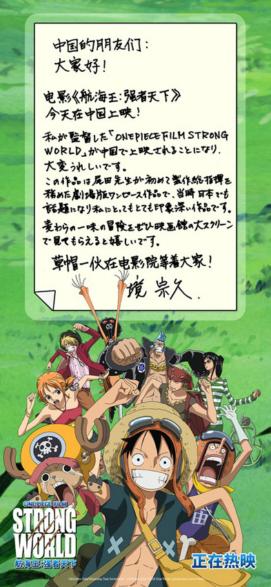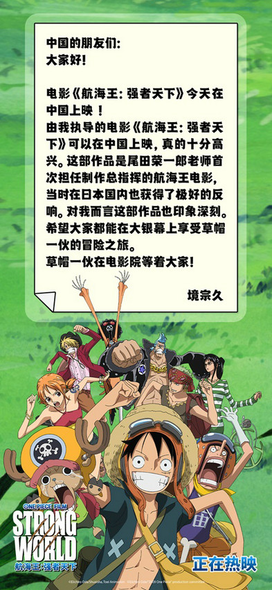 《 环球日报 》 来源标题:电影《航海王:强者天下》今日正式上映 盛夏热血起航看超燃一战 路飞剧照 “航海王”系列第10部剧场版《航海王:强者天下》今日正式上映登陆全国影院,同时官方曝光上映海报和“路飞邀约”版预告。电影讲述了草帽一伙在航行途中经过浮游岛,为拯救伙伴并阻止家乡被毁,路飞等人与海盗金狮子西奇正面对决的故事。影片由原作作者尾田荣一郎首次担任制作总指挥和情节创作,境宗久执导,上坂浩彦担任编剧,自官宣以来影片便备受粉丝期待,在各项数据上均有可观成绩,同时在各平台也收获了超多好评,人气口碑一路飙升,令人十分期待。 全体热血集结 炎炎夏日草帽一伙邀你尽情狂欢! 今日释出的上映海报中,草帽一伙全员以经典造型集结,氛围十分欢乐,以及整体画面的复古风,更加凸显了本次的航行氛围。与此同时海报上的“各位都坐稳了,我们狂欢吧!”文字,也将观众的观影欲望调动到极致,令人想迫不及待的走进影院,感受这场专属于航海王的盛夏狂欢,也再一次邀约着全体海米们来共赴这场夏日盛会。 惊喜片段露出 独家视频看路飞亲自邀约共赴盛会! 今日影片还释出了“路飞邀约”预告,路飞以标志姿势帅气出镜,向中国的粉丝观众表达了问候以及对25年间海米热情支持的感谢,真诚满满地邀请大家一起来参与这场冒险。同时今日曝光的片段中,也可以看到路飞和奈美之间的微妙对话,不仅令人产生好奇,他们口中的最后一句话是什么?奈美为何会有如此反应的呢?这些问题的答案,不妨今日走进影院来一探究竟吧! 电影《航海王:强者天下》作为“航海王”系列的经典高分作品,一直以来颇受全球粉丝的喜爱,在各个国家的评分网站上均获得了超高评价,可见其作品的优质和优秀。“精彩的画面,美妙的剧情,热血的战斗,是个完美的作品”;“这是我心中最好看的一部航海王电影!”;“有草帽一伙陪伴的青春实在太快乐了”。同时影片在国内上映的消息一经曝光后也获得了很多关注和评价“这次终于可以在大银幕看到这部作品了”;“能和海米们一起在电影院看,想想都幸福”;“电影票已经买好,就等着去看了!”由此也可以看出大家对这部作品的热情和喜爱。 电影《航海王:强者天下》由中国电影集团公司进口,华夏电影发行有限责任公司发行,长影集团译制片制作有限责任公司译制,今日正式全国上映。这个暑假,走进影院与草帽一伙相约在影院尽情狂欢吧! 佐罗剧照 奈美&罗宾剧照 草帽一伙剧照 撒谎布&弗兰奇剧照 山智&布鲁克剧照 乔巴&路飞&撒谎布剧照 路飞&奈美&比利 路飞&撒谎布 0823导演手持手写贺图 0823导演手写贺图-翻译 0823导演手写贺图-手写 |
