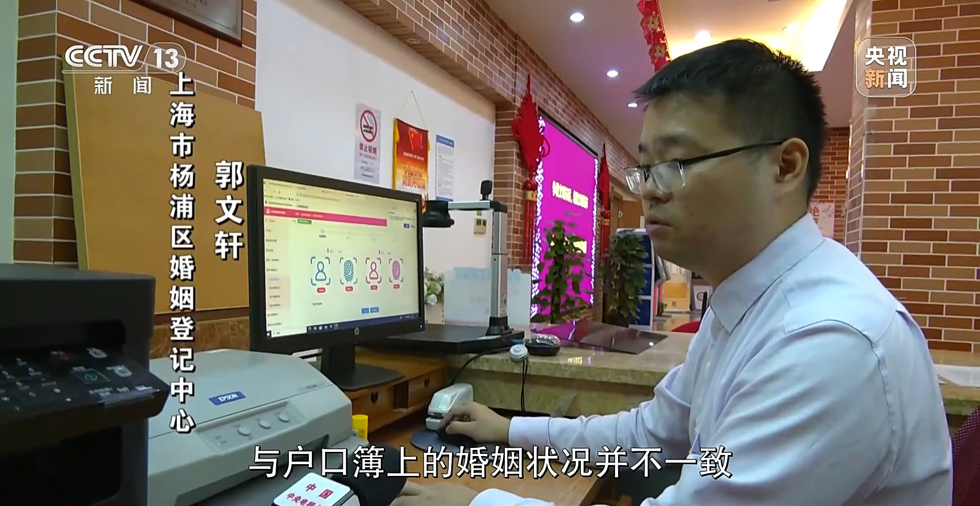 上海市杨浦区婚姻登记中心 郭文轩:实际上,户口簿上的婚姻状况存在很多滞后性,很多人实际上已经结婚或者离婚,没有及时去户籍所在地的派出所去修改,导致实际的婚姻状况与户口簿上的婚姻状况并不一致,最终应该是以全国婚姻登记数据为准。